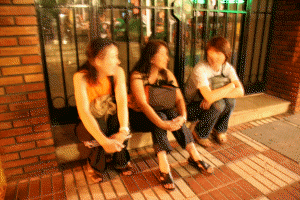 三人は、 「こんなに人が待ってるのだから、ぜぇーったい、おいしいんだわぁ〜。待たなきゃ」 と、座り込んで席が空くのを待つ。 |
